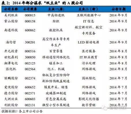 (2)细分市场增长受限谋求“双主业”。在经济增长放缓和移动互联化的双重影响下,部分公司所处行业的空间天花板提前到来,它们开始在新兴产业里寻求新的增长点,通过并购重组形成“双主业”的产业格局。