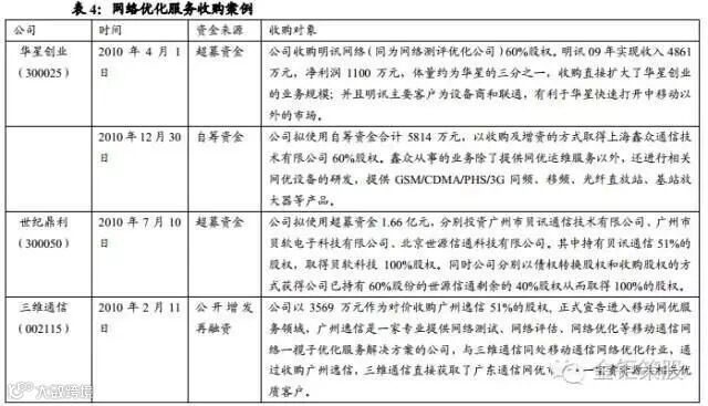 我们以通信行业中的网络优化子行业为例,国内网络优化服务由于定制性较强,现阶段仍是各地方运营商分开采购,市场集中程度非常低,地域划分比较明显。目前国内网优行业有百余家网规网优公司,2000多家运维公司。随着未来运营商加强集团采购及厂商的横向地域扩张,行业竞争将不断加剧,兼并整合将是无线网络优化企业未来发展的主要模式。而网优服务公司由于人工成本较高,且现金流状况一般不佳,这就为资金充裕的公司进行并购提供较为便利的条件。彼时刚上市不久的华星创业(300025),世纪鼎利(300050)以及公布增发预案的三维通信(002115)等网优公司,利用在资本市场的资金优势和知名度的提升,进行行业并购整合,可以获得网优服务行业市场份额的持续扩张。这里华星创业收购上海鑫众通信技术有限公司是为“新产品”;三维通信收购广州逸信是为“新市场”;华星创业收购明讯网络是为“新客户”;而世纪鼎利的收购则“三新”皆有(见下表)。