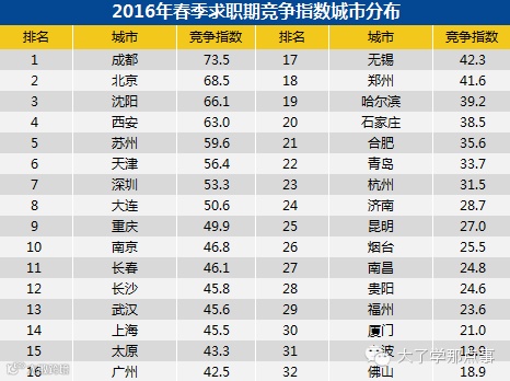 当你再回头看2016年春季求职期各城市竞争指数排行榜,你大概就会明白: