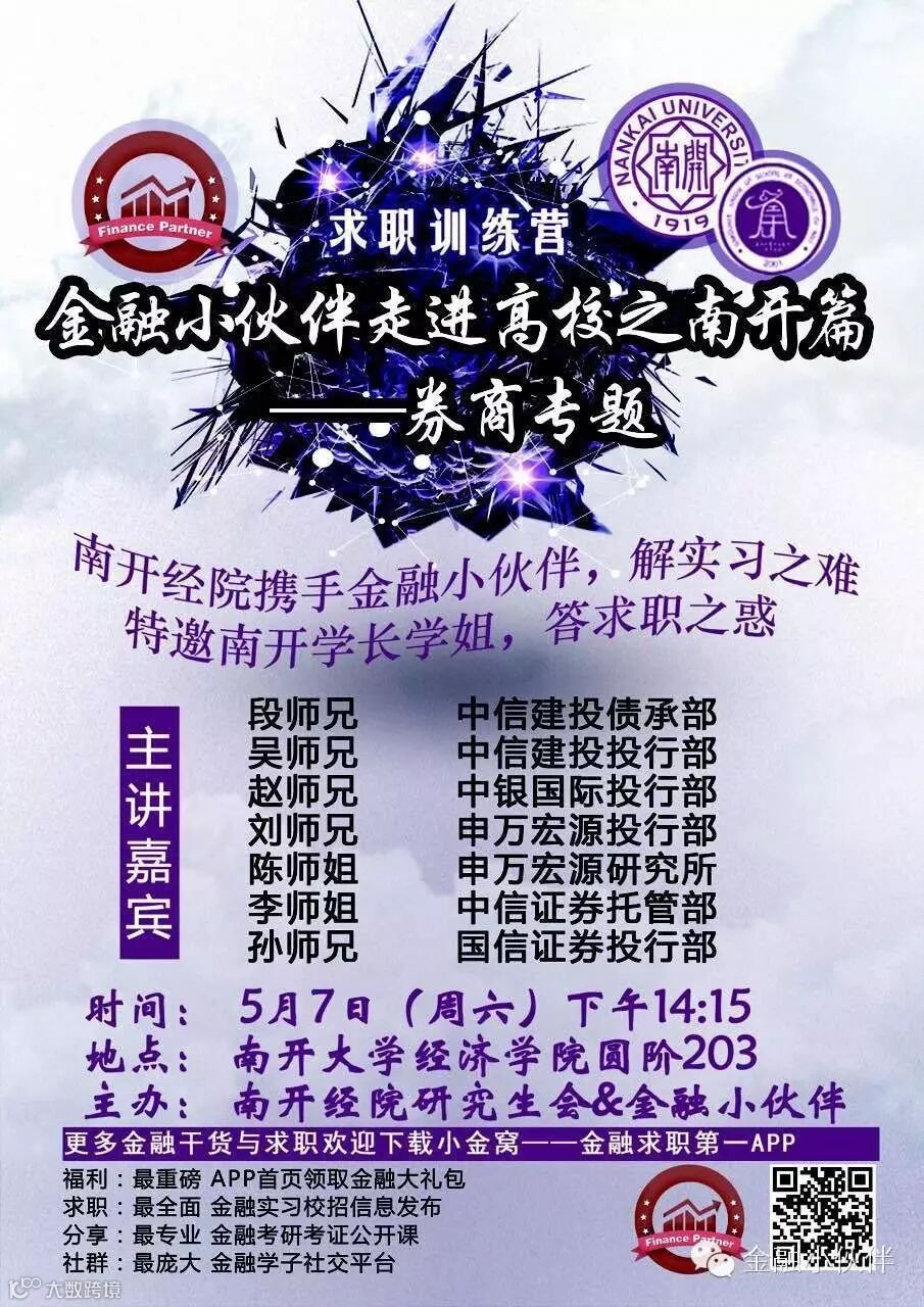 金融小伙伴自成立以来,以“每一个学生都能找到自己满意的工作”为宗旨。致力于为金融学子求职“保驾护航”。为进一步提高、深化学生对金融领域的认识,金融小伙伴特联手各大高校开展系列讲座。欢迎各高校的加入,有合作意向的可扫码联系金融小伙伴相关负责人:刘主席、徐主席。