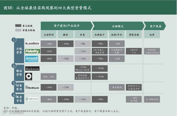 报告指出,全球资产管理巨头们已逐步形成了四大差异化的模式,分别是:全能资管、精品资管、财富管理、服务专家。