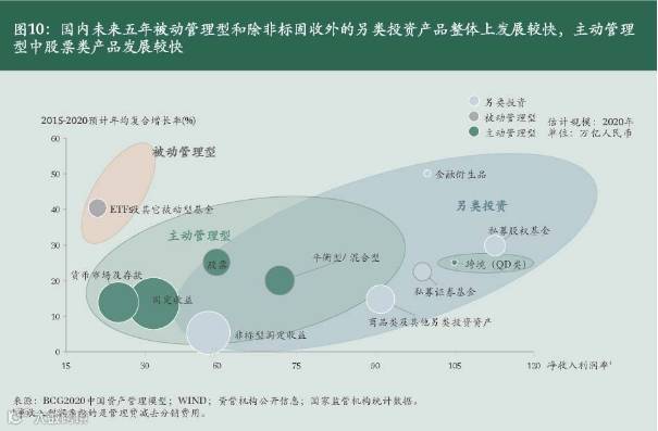 从图9可以看到,根据BCG的预测,主动管理型产品中,股票类产品的增速最为突出,2015-2020年均复合增长率超过25%。以ETF为代表的被动管理型产品增速更高,2015-2020年均复合增长率达到40%。股票类产品和被动管理型产品的发展主要得益于证券市场基础资产池的做大,包括国内资本市场,尤其是股票市场的融资功能有望进一步强化;注册制的推出有望加速中国优质企业在国内上市;混合所有制的深入将继续丰富可流通投资的国有资产等。