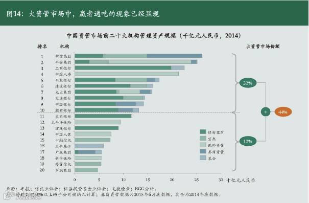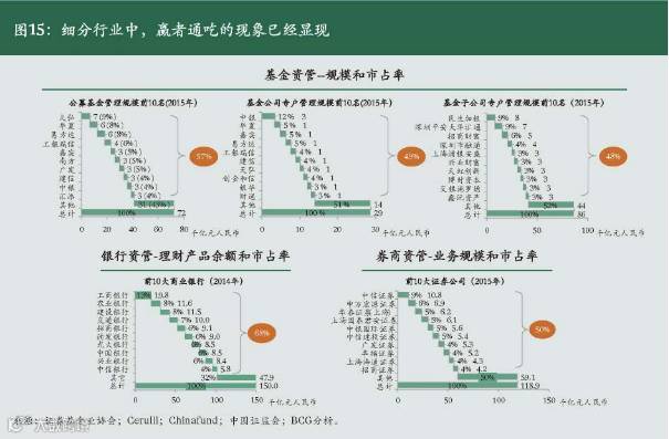 中国资管市场中,“赢者通吃”的现象也已经显现。前十大资管机构管理资产规模市场份额总计32%,前20大资管机构市场份额总计44%,集中度与全球资管市场相近(参阅图11)。在细分行业中,“赢者通吃”的现象更加明显。例如,根据2014年底数据,中国前十大银行理财产品余额合计市场份额占比68%;2015年底,前十大公募基金规模合计占比达57%,前十大基金公司专户规模合计占比达49%,前十大基金子公司专户规模合计占比达48%,前十大券商资管规模合计占比50%。(参阅图12)