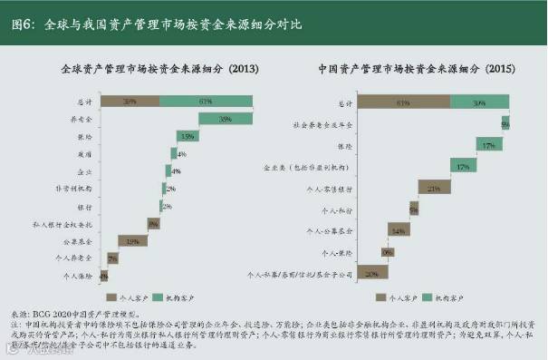 相较于全球市场,我国资管市场资金构成恰好相反:机构资金占比40%左右,其中,险资和企业资金(包括非盈利机构,以及财务公司、投资公司等非金融机构)各自占比17%,养老金仅占5%;个人资金中,高净值客户资金主要投向私行、私募、公募、信托、券商资管、基金子公司专项等,大众客户资金则集中在银行和公募基金。(参阅图6)
