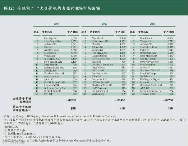 除不同子行业发展快慢不均外,我们从全球市场还观察到一个通行的趋势——资产管理市场“赢者通吃”现象明显。全球资产管理业务的发展经验指出资产管理是一项需要规模效应的业务,成功机构往往在某些特定领域建立规模效应。全球前20大资产管理机构管理资产规模市场份额合计2007年为38%,2009年为41%,2013年为42%,20家机构即占据全球市场近一半(参阅图11)。