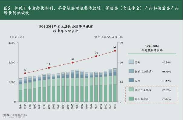 此外,我国老龄化趋势会进一步促进投资理财需求。根据BCG人口数据库的测算,50岁以上的人口占全国人口的比例在2010年为24%,2020年将上升至33%,这十年间退休人口预计增加1.5亿。老龄化趋势在短时间内不可逆转,而现有的社会保障体制仍较难满足日益增长的养老需求。因此,具备保值增值能力和跨期配置属性的金融产品,如商业养老保险、理财规划、理财产品等成为了重要的替代型养老手段,拥有巨大的增长空间。参考日本经验,伴随着老龄化的加剧,可能会出现居民金融资产配置的结构性变化,家庭资产配置整体上会呈现向保险类产品和低风险的储蓄类产品倾斜的趋势。(参阅图5)
