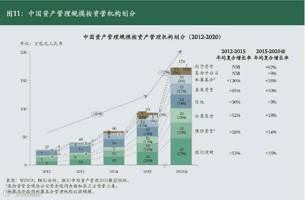 4月6日,中国光大银行与波士顿咨询公司(BCG)联合发布《中国资产管理市场2015》报告,报告表示,截至2015年底,市场管理资产总规模达到约93万亿元人民币,过去三年年均复合增长率为51%。2020年预计将达到174万亿元人民币;其中,剔除通道业务后预计规模达149万亿元人民币,2015-2020年年均复合增长率为17%。