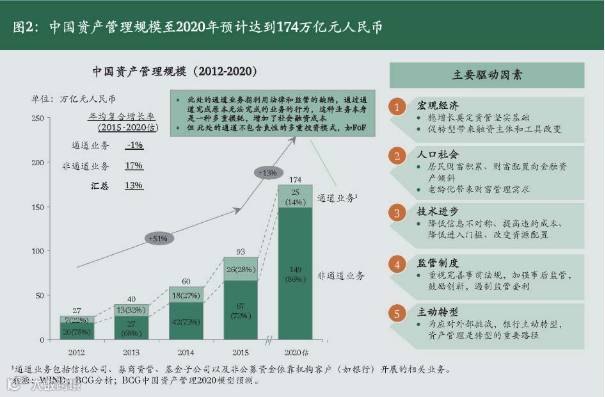 展望中国资产管理市场规模及五大增长动力。报告指出,截至2015年底,市场管理资产总规模达到约93万亿元人民币,过去三年年均复合增长率为51%。2020年预计将达到174万亿元人民币;其中,剔除通道业务后预计规模达149万亿元人民币,2015-2020年年均复合增长率为17%。这背后的五大支撑动力包括宏观经济“稳增长、促转型”、居民财富积累并向金融资产转移、金融科技进步、监管鼓励、银行业主动转型等。