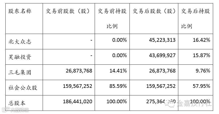 首先,实际控人从有到无。本次交易前,大股东三毛集团持有三毛派神2687万股股份,持股比例为14.41%,其他股东持股比例均不超过5%,三毛集团为公司绝对控制人。本次交易完成后,众志芯科技原来的100%控股股东北京北大众志微系统科技有限责任公司将获得三毛派神4517万股股份,持股比例16.41%,成为上市公司第一大股东。但由于北大众志与昊融投资以及公司原控股股东三毛集团持有公司股份比例较为接近,均低于20%,互相不存在一致行动关系,且均无法在公司董事会占据半数以上席位,均不能单独控制董事会和管理层决策、单独支配公司行为,因此公司将不存在实际控制人。