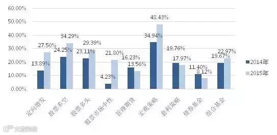 据朝阳财富基金研究中心统计数据显示,套利策略基金2015年全年获得17.97%的平均收益,相比2014年的19.76%的收益略低1.79%。套利策略主要运用股指期货套利、分级基金套利、ETF套利、可转债套利等套利方式获取收益。