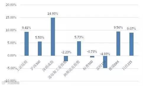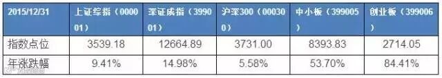 2015年上证综指、深成指、沪深300指数分别上涨9.41%、14.98%和5.58%。中小板指数和创业板指数更是飙涨了53.70%和84.41%。从全球来看,我国主要指数的整体涨幅也跑赢了全球的大部分股指。