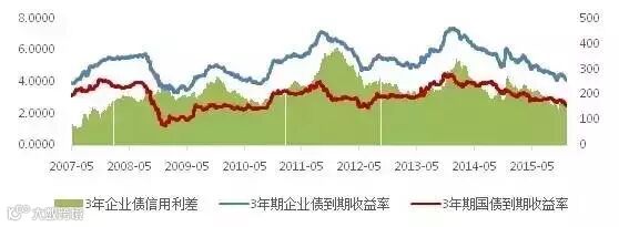 图15:3年期国债及企业债到期收益率(%)及信用利差(bp)历史走势