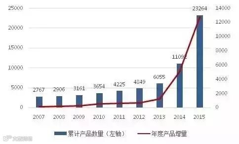 2015年私募基金的数量出现了井喷,新增的阳光私募产品发行数量为12172只,是2014年发行量的2.4倍。从下图可以看出,产品数量呈现指数化的上涨,从2007年的2767只暴涨至2015年的23246只。而出现大幅上涨的原因有:1.政策监管、社会各界都给私募一个更加公平的发展环境;2. 2015年A股行情的高涨带动投资热情高涨。私募基金作为资产配置的重要组成部分,随着我国金融市场的发展,投资工具的丰富,正在进入一个高速增长的阶段。