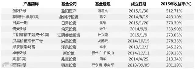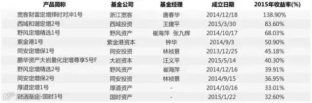 2015年股票市场跌沓起伏,股票策略在2015年上半年经历了疯狂上涨之后,部分私募管理人也在股灾中受伤严重,不过今年整体表现仍可圈可点,股票多头策略的阳光私募基金年度收益为27.5%,而同期上证指数的涨幅为9.41%。收益排名前十的股票策略产品更是录得惊人回报,平均收益高达328.94%。位列第一的盈阳7号今年以来收益高达512.71%。泽泉投资旗下的泽泉景渤财富今年涨幅达245.22%,其产品的主要收益来自于上半年,投资经理辛宇操作手法凌厉,6月份意识到风险后,将其产品股灾前清仓,完美逃顶。