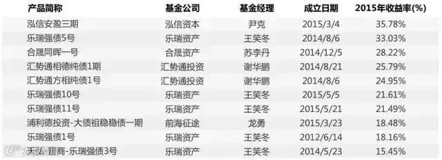 从2015年债券策略排名前十的基金来看,乐瑞资产旗下基金占据了四席。乐瑞资产旗下的强债策略产品在以债券投资为主要投资标的之下,以大类资产配置为核心理念,通过低风险的债券投资加其余高收益资产的动态调节实现了乐瑞强债系列产品的抢眼表现。