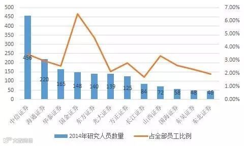 另一个小编注意到的点是,海通的研究业务有生力量确实是一只相当庞大的军团。2011年公司研究人员共174人(包含自营、资管等的研究人员),在全部7294人中占到2.39%。到2014年,研究人员数量已增加到220人,占比2.94%。为了和同行业的情况进行对比,小编随机抽取了十几家券商的2014年年报,对研究人员的绝对数量和在整体员工中的比例都进行了对比,海通证券的研究力量在绝对数量上仅次于中信证券,较样本中排名紧随其后的华泰证券研究人数要高出33.3%,占全体员工的比重和其他样本相比也绝对不算低,从侧面可以反映出公司对于研究业务的重视。
