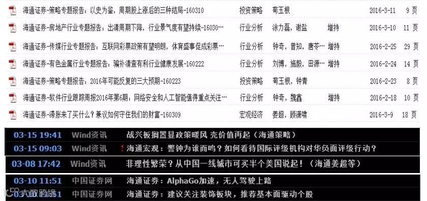 2015年新财富拉票季,一篇关于海通分析师的报道《海通证券研究所:人在江湖飘 哪能没有票》描绘的海通新财富分析师们的生活更是让小编感慨良多,那些荣耀的冠冕、闪光的口碑,都是靠着海通分析师们无数次飞行、无数次路演、无数个赶点评和报告的凌晨一点一点积累出来的。因此本着对海通研究所大牛们的某种“粉丝心理”和对分析师们职业态度的仰慕,小编时不时会专门上慧博跟踪一下海通出的新研报,时常会找到一些“惊喜”--比如结合海外行业发展状况的深度专题和当前行业热点的详细报告,例如前段日子大火的虚拟现实VR,小编对其的了解就是被海通一篇《从消费电子产品成功经验与失败教训看VR爆发可能性》科普的。平时做日报时,也经常能够看到海通跟踪热点的报告点评,不管是阿尔法狗带来的人工智能大讨论,通胀还是滞涨的争论,是一线房市的非理性繁荣,还是欧银决议大放水的后续,只要动手搜一搜,总有一款适合你。