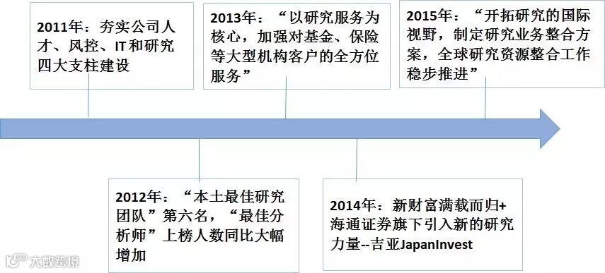 2013年,公司对研究服务提出了更高的要求,要“以研究服务为核心,加强对基金、保险等大型机构客户的全方位服务”,研究所更是在首席李迅雷的领导下实现弯道超车,在新财富中取得了本土最佳研究团队第一名的好成绩。14年年报称海通旗下的海通国际证券收购日本上市公司吉亚JapanInvest,进一步增强对机构投资者的研究服务能力,并详细列举了当年新财富多组夺得行业魁首的赫赫战绩。