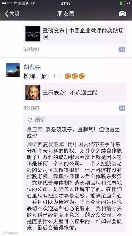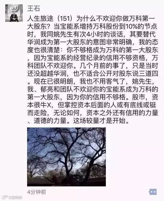 12月8日,王石在朋友圈发文:2015年开年,“万万想不到”;年末圣诞节前,万科股票骤然两个涨停板,都是刷屏的财经新闻。1988年万科股改时,老王就放弃了股权,表明了对拥有财富的心态,也表明了我同团队一起做职业经理人,把万科打造成现代优秀企业的自信。既然放弃了股权,作为一家上市公司,谁想成为或实际成为万科的大股东,不是职业经理管理层能左右的。但能做的只能是为全体股东创造财富,为消费者提供满意的产品,为社会承担责任,并捍卫以尊重自然、尊重人类为核心的价值观和万科文化。“现在已很明朗(指宝能上位第一大股东),我也不用客气了,姚先生(指姚振华),我、郁亮和团队不欢迎你的宝能系成为万科的第一大股东。”12月17日晚八时,王石通过微信朋友圈直接对外亮出手中底牌:万科,不会是“宝能系”的万科。