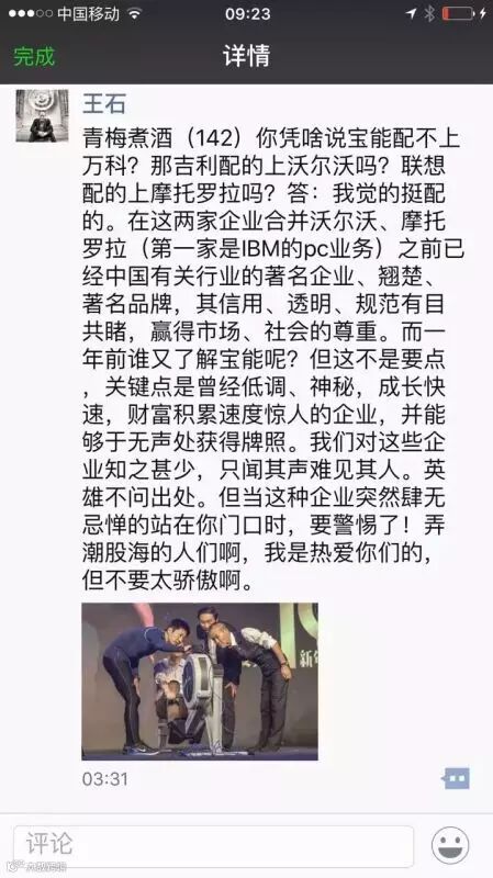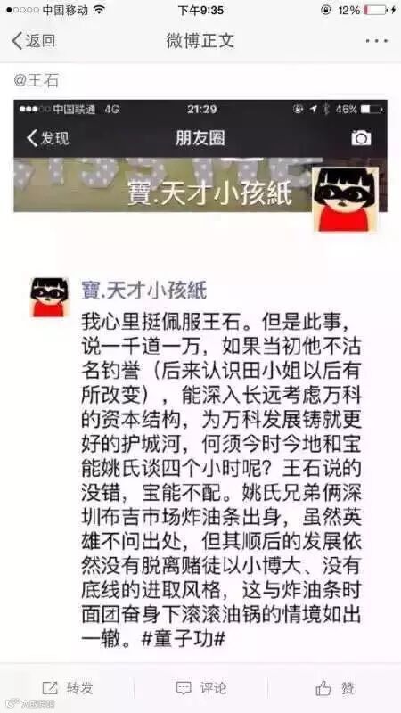 7月13日,他在微信上转发《野蛮人敲门!一位潮汕大佬花79亿狂扫万科股票》,其的点评是“深圳企业,彼此知根知底”。