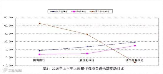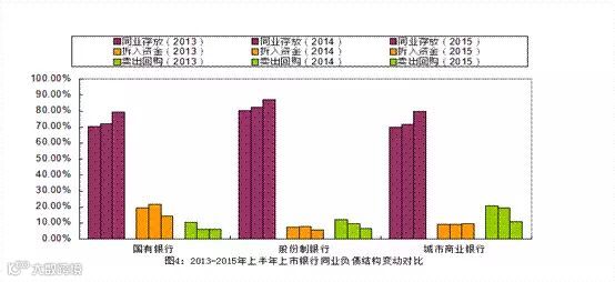 16家上市银行同业负债占负债总额比重为17.42%,,同比上升3.17个百分点。2015年半年末,16家上市银行中,8家股份制银行总负债规模或存款规模为5家国有银行总量的三分之一左右,而同业负债总额则约为国有银行同业负债总额的73.14%;3家城市商业银行总负债规模或存款规模为5家国有银行总量的3%左右,而同业负债总额则约为国有银行同业负债总额的5.83%。