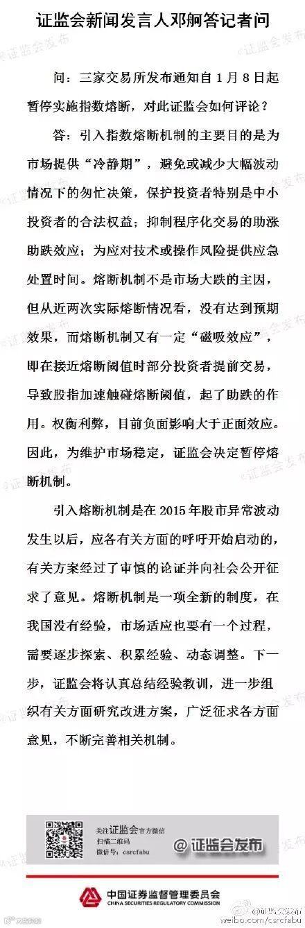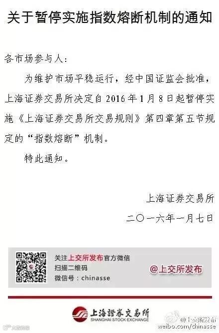 1月7日当晚,上交所、深交所及中金所联合发布通知称决定暂停实施制度熔断机制。“经中国证监会同意,上交所、深交所及中金所决定于1月8日起暂停实施指数熔断相关规定。”