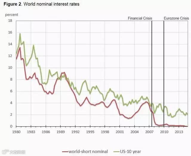 自那时以后发生了很多事。在次级债危机和欧洲主权债务危机之后,发达国家和一些新兴市场国家进入了一个前所未有的低自然利率的世界(注:自然利率是指假设所有价格具有充分弹性,令总需求与总供给永远相等时的利率水平)。伴随着如此之低的自然利率,由于名义利率萎缩至接近零的下限,均衡机制几乎没什么空间来发挥作用。事实上,观察图2就知道,全球名义利率从2009年以来就一直停留在零利率附近。然而,有价值的安全资产的当地需求和供应之间的错配依然存在。