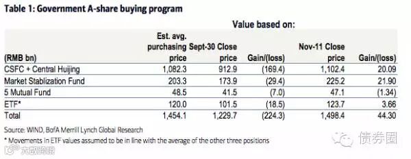 美银美林根据A股上市公司披露的前十大流通股股东名单估算,中国政府第三季度用于救市的资金总额至少为1.5万亿元。