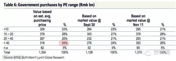 美银美林估测,第三季度,剔除ETF持仓,政府救市资金至少了购买了1365家A股上市公司股票,占A股企业数量的49%,购买量占A股流通股总量的7%左右。