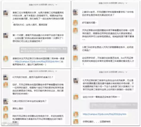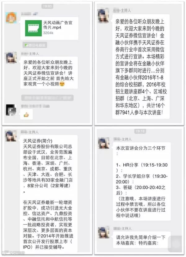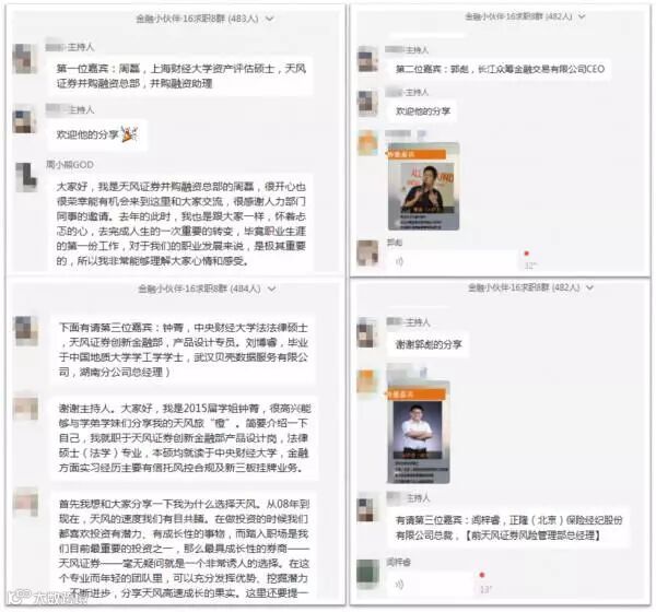 本次活动得到金融小伙伴平台的鼎力支持,通过机器人转播,在16个群同时开展宣讲会,规模空前。