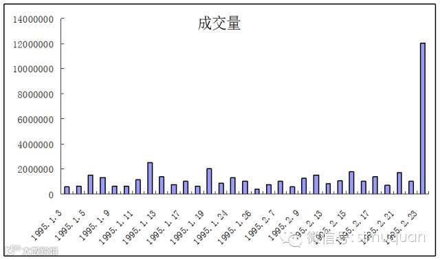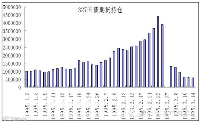 2月22日周三,受贴息消息刺激,92国债行情开始启动,319合约当日剧升0.9元,但同为92国债的327品种却基本未动,显示空头主力集中与此,当日327未平仓合约数达到了360万口(较年初增加了200万口),相当于面值720亿,是债券总发行量的3.6倍。1995年2月22日晚上财政部为了完成当期国债发行任务,公布了95年国债发行计划,3年国债利率高于定存1.76%(这个可是大贴息),仍然体现了国债优先的原则,923国债贴息的概率大为增加,这时盲目的做空风险极大。