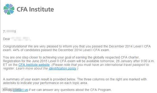 以2015年6月CFA一级、二级考生的成绩查询为例,成绩将在美国东部时间7月28日上午9时后通过电子邮件发送, 届时考生注册邮箱将收到协会发送到一封邮件标题为“Your CFA Exam Result”的邮件。 让大家抢先看看CFA成绩单长成啥样子、成绩单都有什么。