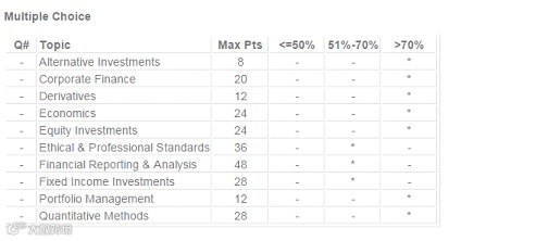 评分体系: CFA考试中会对各个科目单独评分,每个科目的成绩分为三档:<=50%、51%-70%、>70%,并且给出了每一科目的正确率属于哪一档,最后会直接告知考生是否通过,至于具体的答对题数,CFA不会公布。每一个级别都是类似的,只是各个级别的通过率不尽相同。CFA协会会把考生各个科目成绩汇总做加权平均,从而评判考生是否能通过考试。CFA协会官方尚未公布具体的通过标准,以下标准为根据历年考生的实际通过情况进行估算的:考生正确的答案数量>=全球成绩排名前1%的考生的平均正确答案数量的70%。