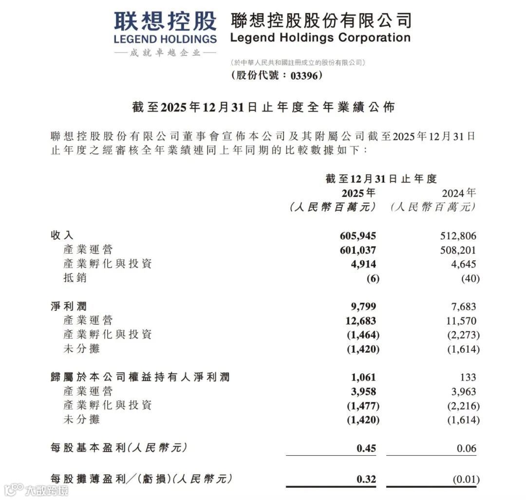 联想控股2025年收入6060亿元,首次突破六千亿;净利润98亿元,同比增长28%。联想集团贡献核心增长:PC业务全球份额达25.3%,AI PC占PC出货量超30%;基础设施业务AI服务器订单储备超千亿元。