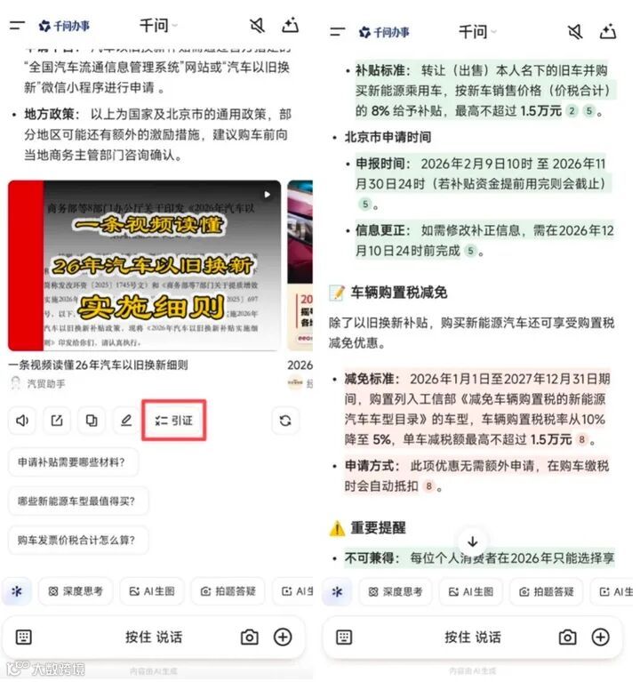 千问上线"引证"功能,针对新闻时事等回答提供信源核查。关键信息自动标注:绿色高亮表示可靠信源支持,红色标记提示需进一步验证。该功能目前处于测试阶段。