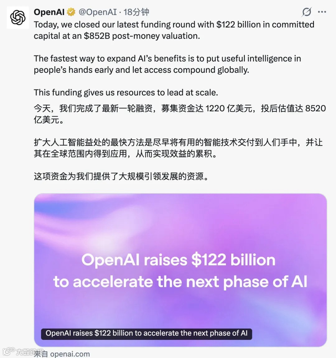 OpenAI宣布完成1220亿美元融资,估值达8520亿美元。软银、英伟达、亚马逊联合领投,微软持续跟投。公司首次向个人投资者开放渠道,募集超30亿美元。资金将用于AI芯片采购、数据中心建设及人才招募。最新数据显示,ChatGPT周活跃用户近9亿,付费用户超5000万,月收入20亿美元,企业业务占比超40%。