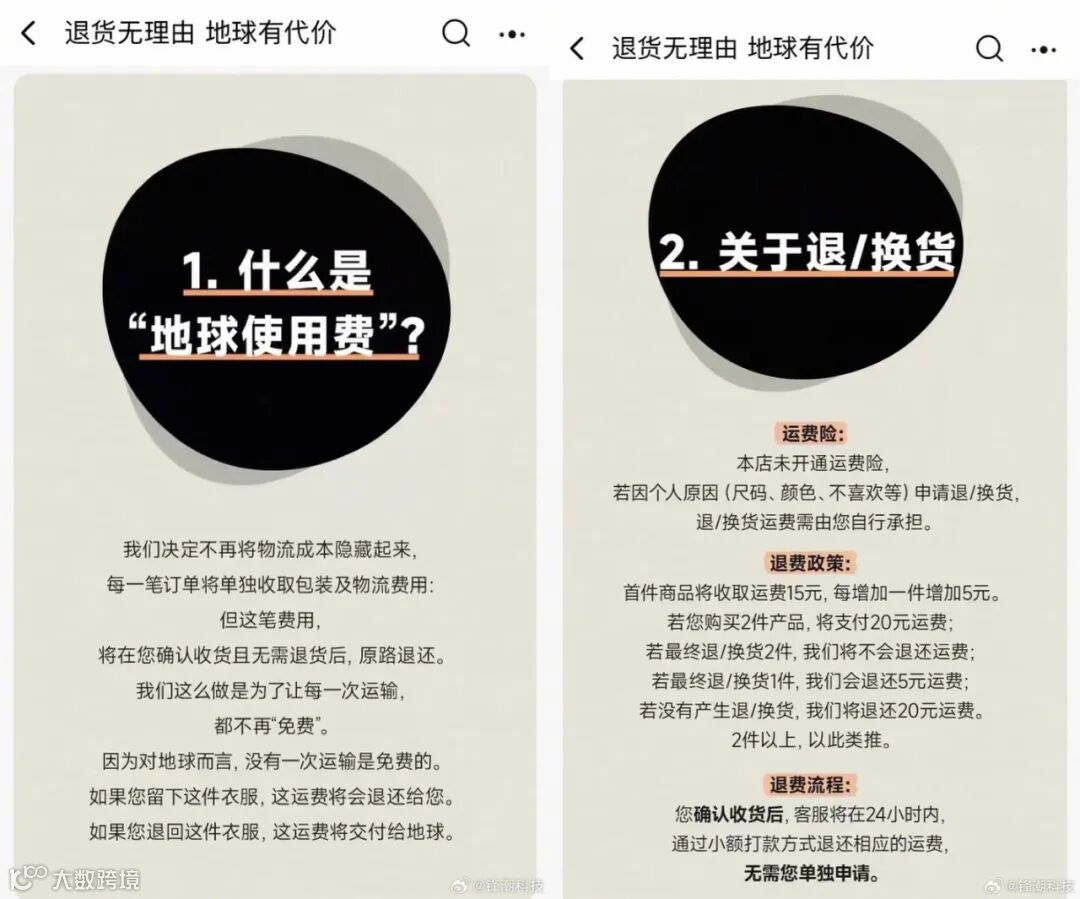 Patagonia天猫旗舰店实施"地球使用费"机制,首件商品收取15元运费。若未退换货则24小时内退还;退货运费不予返还,全额捐赠环保公益项目,且不支持运费险。