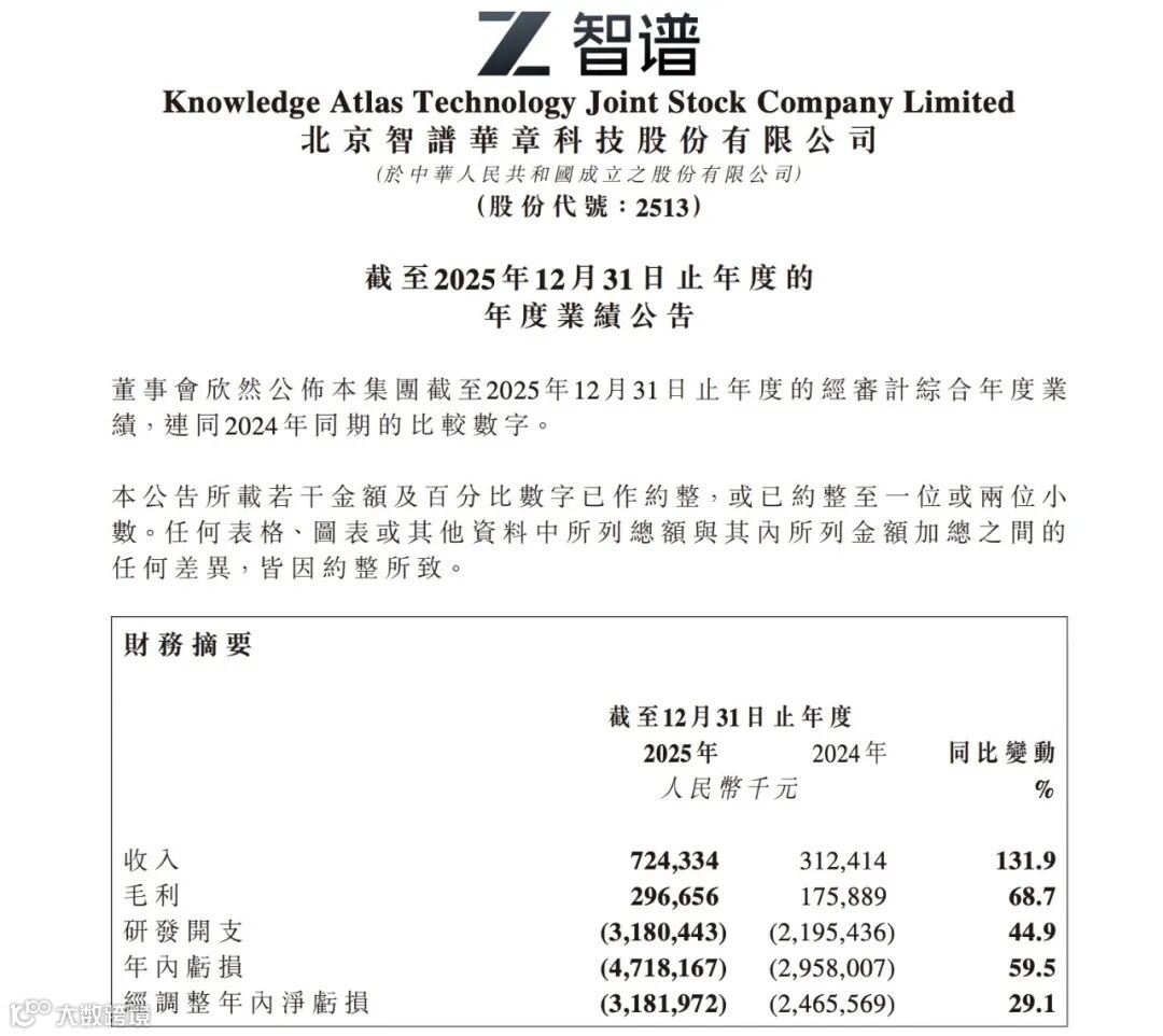 智谱2025年营收7.24亿元,同比增长131.9%;净亏损47.18亿元,同比扩大59.5%。亏损扩大的主因是研发投入增至31.80亿元。三大业务线均高速增长,上市后股价累计涨幅近五倍。