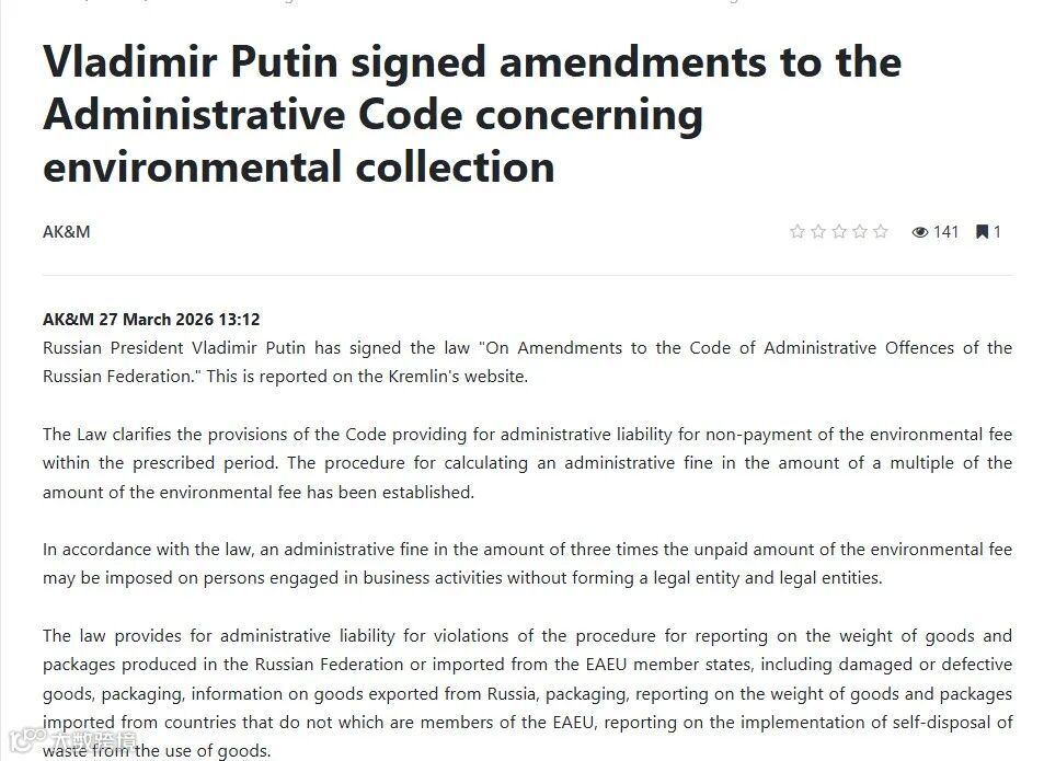 2026年2月,普京签署《行政违法法典》修正案,逾期未缴环保费将面临未缴金额三倍的罚款,涵盖个人及企业主体。
