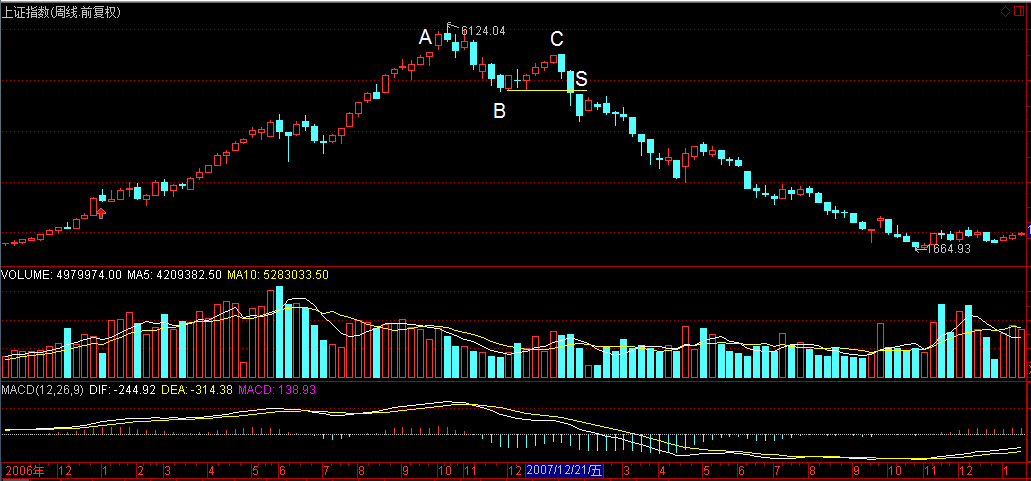 下图是上证指数最著名的一蹶不振图谱。从历史最高点6124下跌到4800点,然后反弹到5500点无力创出新高,然后跌破4800点,著名的历史大牛市结束。此时如果知道一蹶不振这个趋势改变的图谱,卖出并空仓等待,一点都不晚。最终跌倒1624点才开始大反弹。