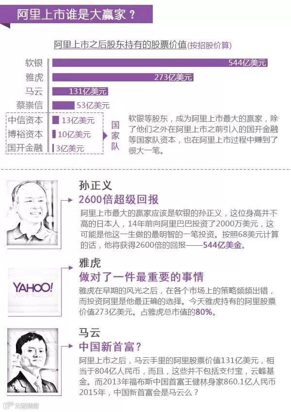 当然,以阿里巴巴上市为节点,国内的富豪榜也会发生本质的变化,马云、马化腾、李彦宏占据前三,随后才是传统富富豪王健林、宗庆后等等,科技力量的崛起是中国国家转型的成功标志。