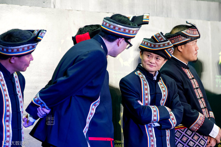 和中国大多数企业家不同,马云基本上所到之处,无论是媒体还是普通人都一样爱待他。图为2014年4月21日,广西南宁,参加2014中国绿公司年会的柳传志、朱新礼、马云、曹国伟等人穿上广西少数民族服饰走秀,与平时形象迥异,令在场嘉宾捧腹大笑。