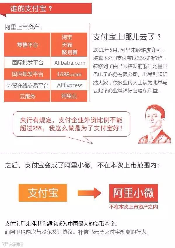 1999年,马云创办阿里巴巴网站。有人说,这是把万吨邮轮抬到喜马拉雅山上。2011年,马云招遇“违背契约精神”质疑,为了拿到第三方支付牌照,未与大股东协商,马云将支付宝转给一家由他控制的内资公司浙江阿里巴巴电子商务有限公司。为他在香港,纽约上市带来一连串的问题。