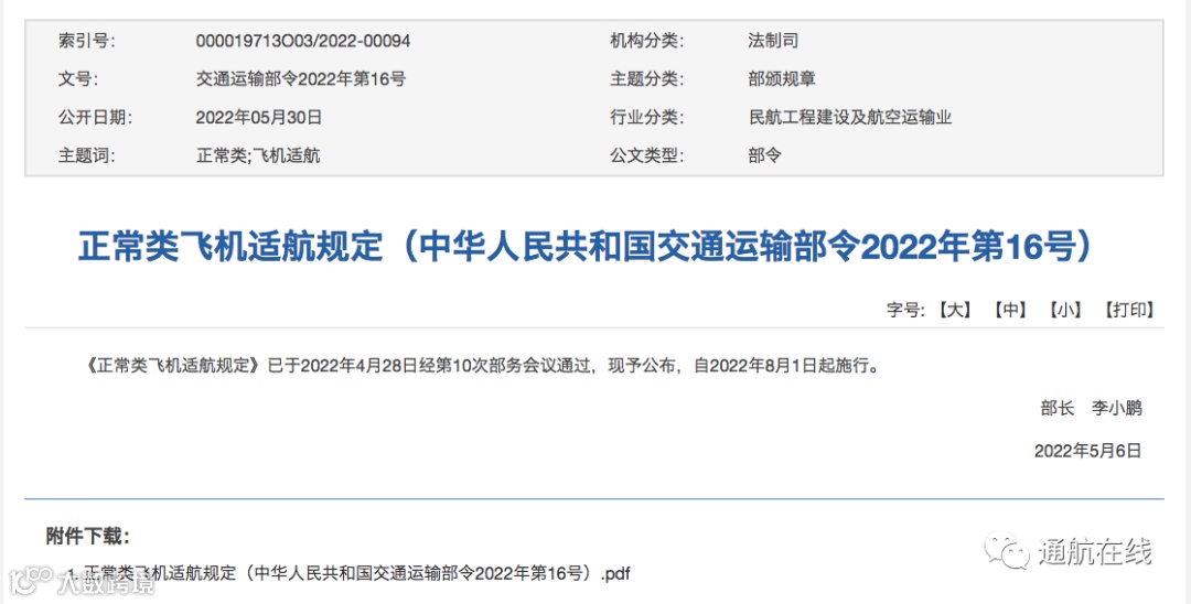交通运输部 正常类飞机 适航审定规定