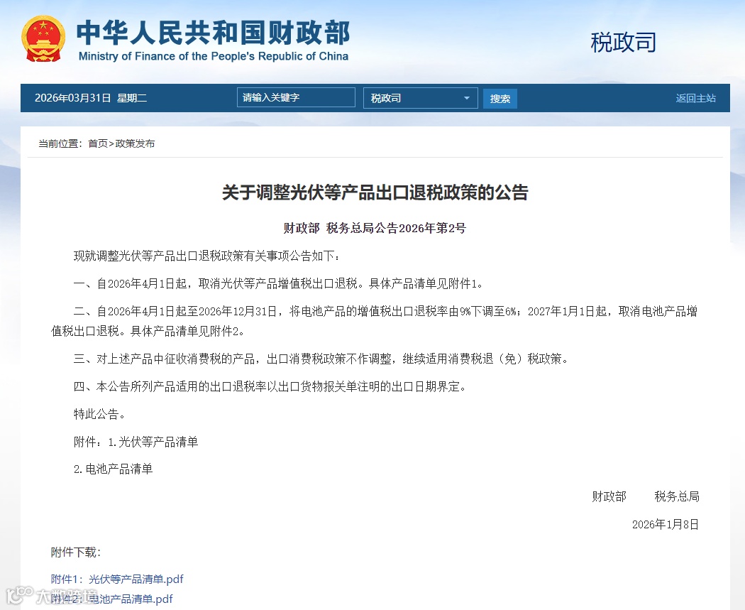 2026年1月9日,财政部与国家税务总局联合发布《关于调整光伏等产品出口退税政策的公告》(财政部 税务总局公告2026年第2号),宣布重大政策调整。
