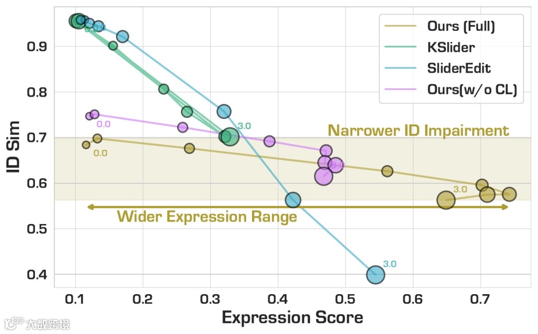 从这张量化图来看,更重要的不是某个单点的绝对值,而是整体轨迹是否合理。理想的表情编辑方法,不应通过几乎不改变表情来维持高身份相似度,也不应通过严重破坏身份来换取更强的表情幅度。PixelSmile 的优势在于对二者进行了更稳定的联合优化。