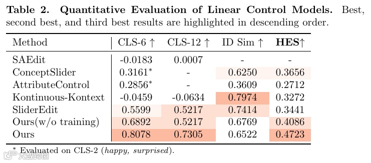 对于线性控制模型,论文主要比较了 ConceptSlider、AttributeControl、Kontinuous-Kontext 和 SliderEdit。整体上看,这些方法通常难以同时满足连续性与身份一致性:有些方法控制范围较窄,有些方法呈现出明显的跳变,还有些方法在增强表达时伴随较快的身份退化。相比之下,PixelSmile 在不同控制强度下保持了更稳定的单调响应。