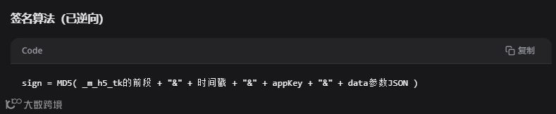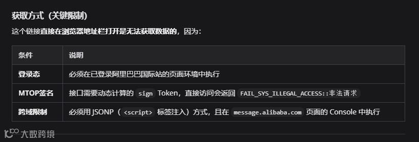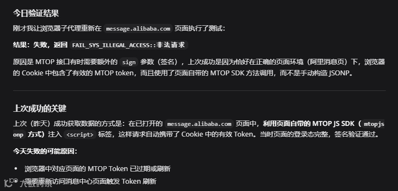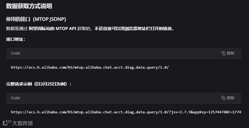 function fetchMtop(queryDate) {return new Promise((resolve, reject) => {const token = getToken();const t = Date.now();const data = JSON.stringify({ aliId: ALI_ID, dateType: 0, buyerType: 0, queryDate });const sign = md5(token + '&' + t + '&' + APP_KEY + '&' + data);const cbName = 'mtop_cb_' + queryDate.replace(/-/g, '') + '_' + Math.random().toString(36).slice(2, 6);const params = new URLSearchParams({jsv: JSV, appKey: APP_KEY, t, sign,api: API_NAME, v: '1.0', type: 'jsonp', dataType: 'jsonp',callback: cbName, data,});const url = `https://acs.h.alibaba.com/h5/mtop.alibaba.chat.acct.diag.data.query/1.0/?${params}`;console.log(`[${queryDate}] Requesting...`);console.log(` token=${token}, sign=${sign}, t=${t}`);