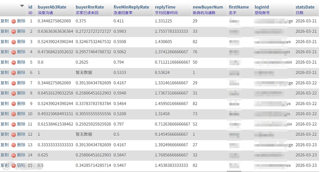 <?phpclass MetricAction extends Action {public function index() {// 1. 实例化模型$Model = M('shop_7day_core_metrics');// 2. 定义需要提取的字段$fields = 'buyerAb3Rate, buyerRnrRate, fiveMinReplyRate, replyTime, newBuyerNum, firstName, statsDate';// 3. 查询数据,按日期升序排列,确保图表时间轴正确$rawData = $Model->field($fields)->order('statsDate ASC')->select();// 4. 数据处理:转化为百分比并保留两位小数$formattedData = array();if ($rawData) {foreach ($rawData as $row) {// 深度沟通率$row['buyerAb3Rate'] = round($row['buyerAb3Rate'] * 100, 2);// 买家已读未回率$row['buyerRnrRate'] = round($row['buyerRnrRate'] * 100, 2);// 急速回复率$row['fiveMinReplyRate'] = round($row['fiveMinReplyRate'] * 100, 2);// 平均回复时间 (假设数据库里直接是数值,不需要转换)$row['replyTime'] = round($row['replyTime'], 2);$formattedData[] = $row;}}// 5. 将处理好的数据转为 JSON 格式,方便前端 JS 调用$this->assign('chartJsonData', json_encode($formattedData));// 6. 渲染视图$this->display();}}?>