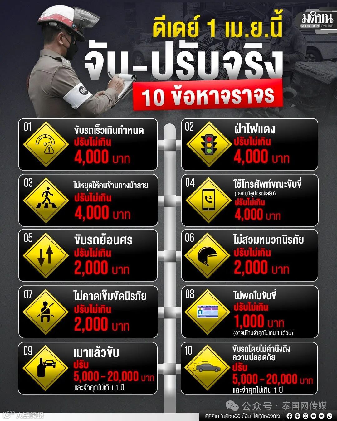 超速行驶:最高罚款4000泰铢(此前为1000泰铢)